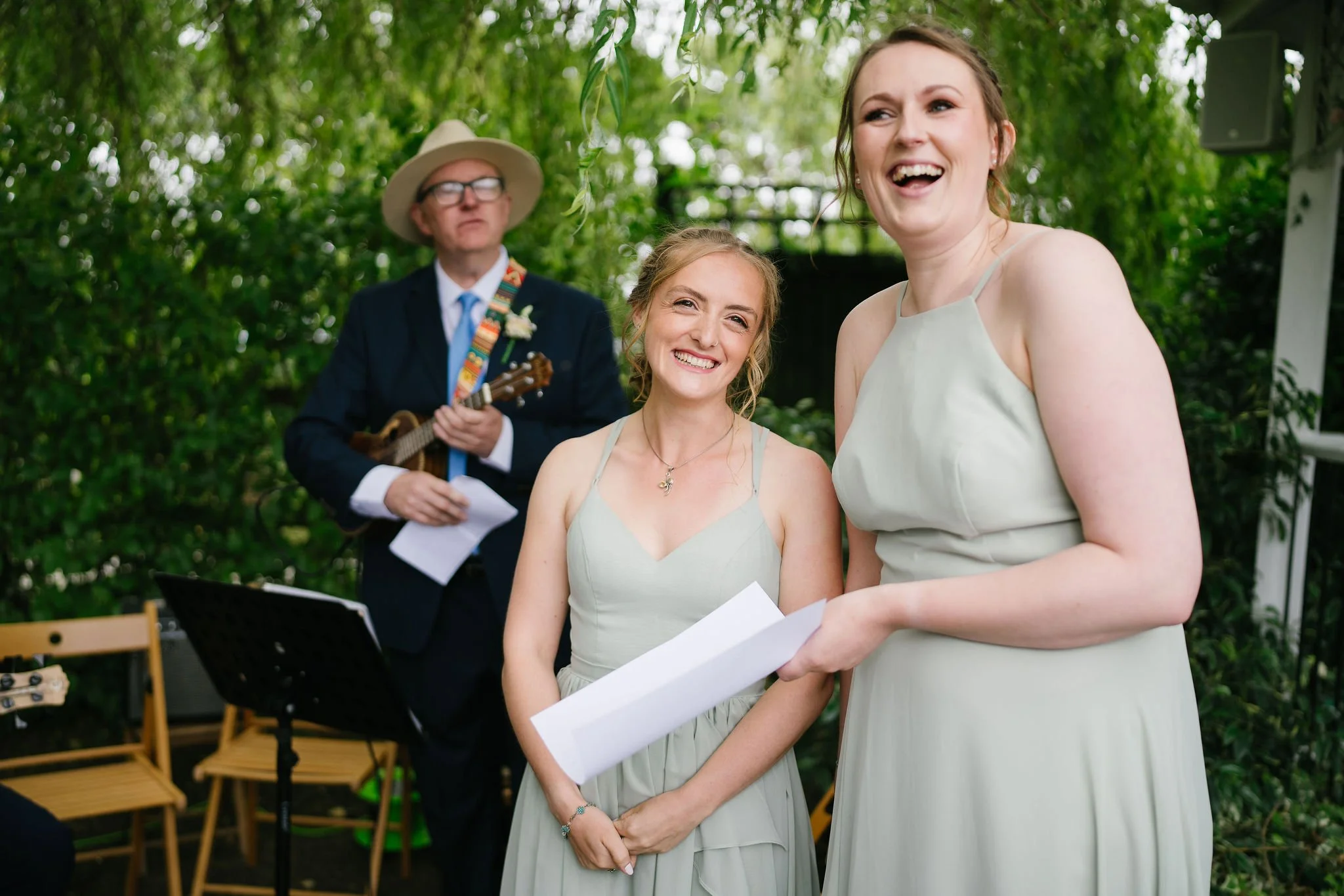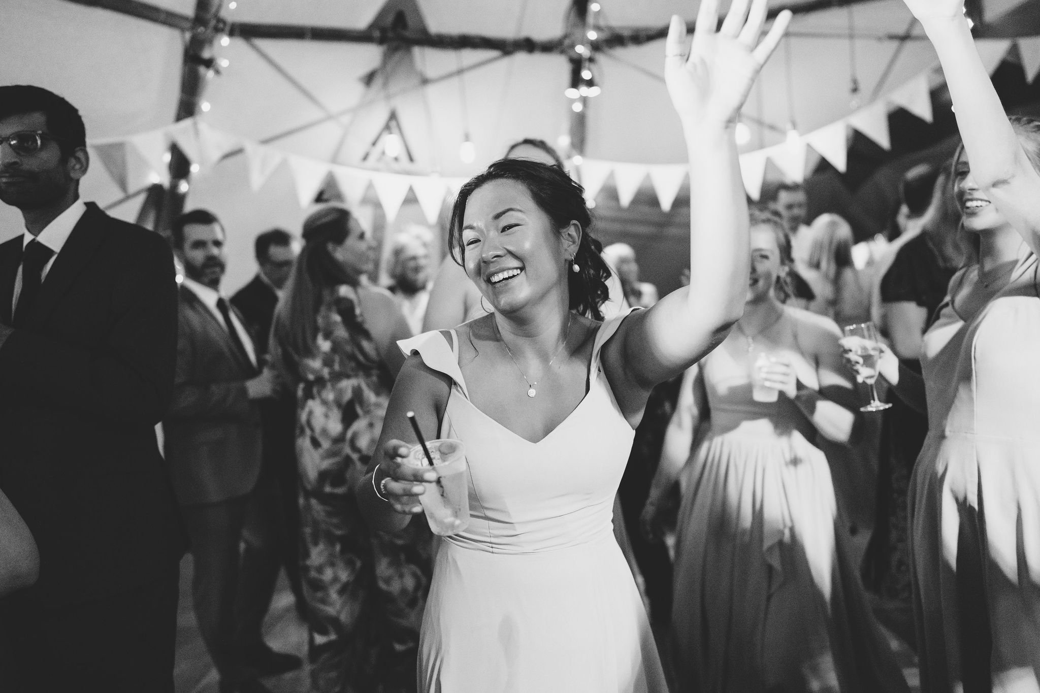 Liddy and Joe got married at The Crescent Turner in Whitstable, and even though it rained all day it's still one of the most fun weddings I've ever photographed. The Crescent Turner is a stylish 18-bedroom boutique hotel perched at the top of Wraik Hill just outside Whitstable, with panoramic views across the estuary, the Kent coastline, and out to the Isle of Sheppey. The name actually comes from JMW Turner, who painted the Seasalter Flats that the hotel looks out over. The venue has two acres of grounds, a terrace for ceremonies, and a large tipi that can seat up to 176 guests for the reception, which makes it genuinely flexible for all weathers. Liddy and Joe went ahead with their outdoor garden ceremony despite the rain, which gave the day a proper character, before moving into the tipi for the celebrations. They brought their dog along for the day, had a samba band playing in the afternoon, and a rock band taking over in the evening. The rain didn't slow anything down and the tipi kept everyone together in one big, happy party.
